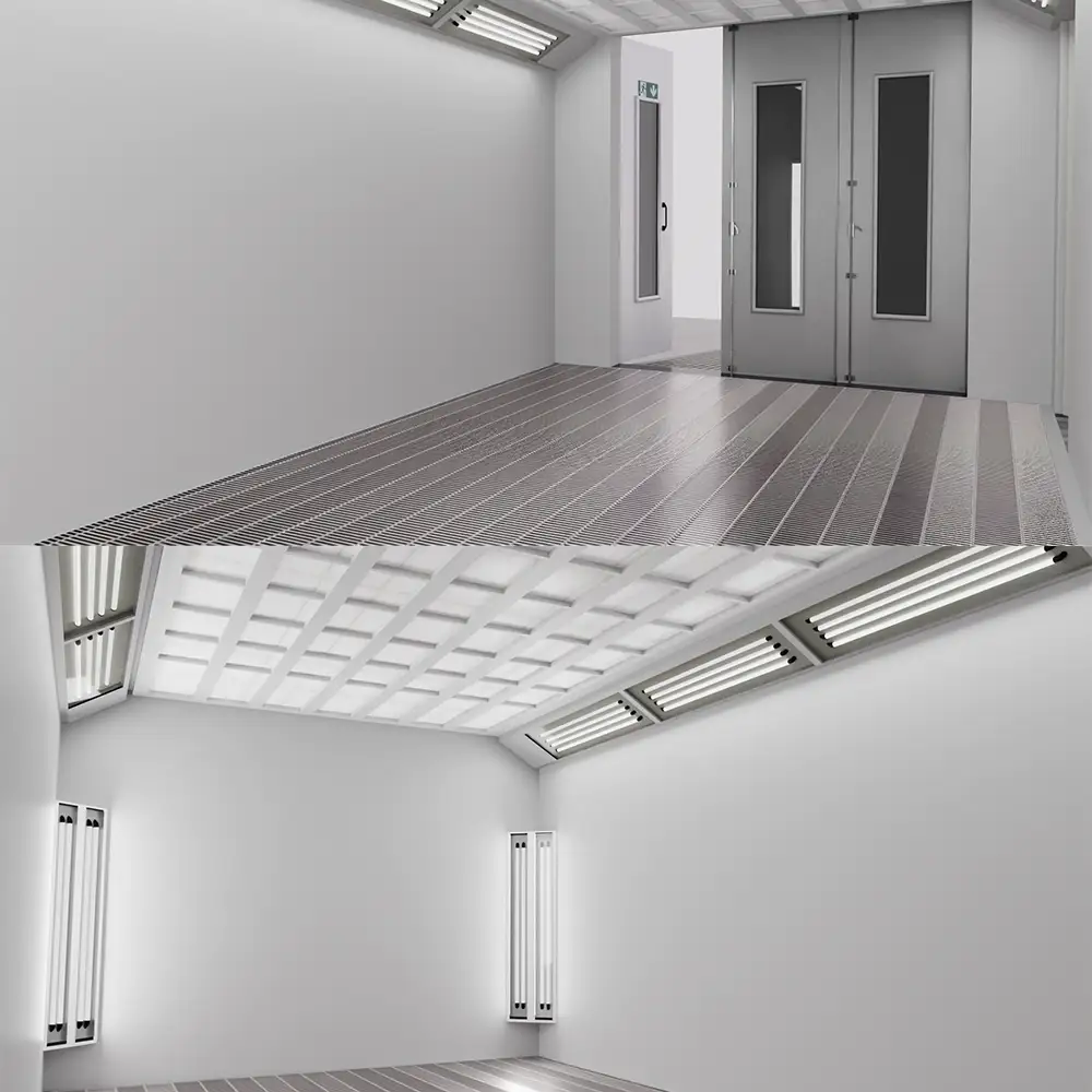 Der Kabinenboden ist vollständig mit verzinkten Gitterrosten ausgestattet, die einer Belastung von bis zu 500 kg pro Reifenaufstellpunkt problemlos standhalten. Alle Bodenelemente werden aus verzinktem Stahl hergestellt. Unter den verzinkten Gitterrosten im Boden befinden sich zweistufige Filter bestehend aus einer EU3 und einer EU4 Schicht. Ein solcher Filteraufbau bietet einen wirksamen Schutz vor Verunreinigungen des Abluftventilators und sorgt für eine hohe Effizienz der Lüftungsanlage.